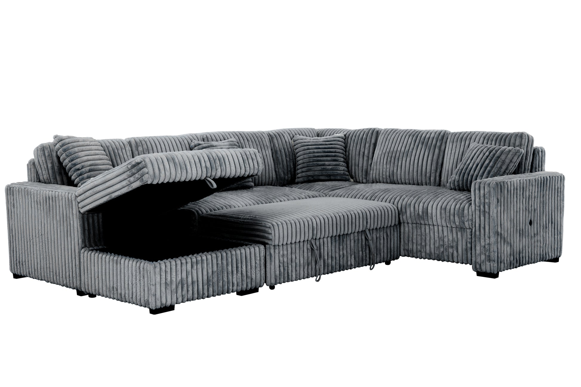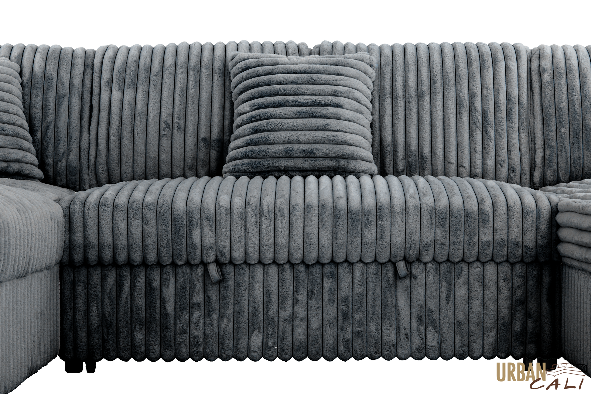 - Minky Corduroy Fabric Upholstery & Smart Storage – Featuring luxuriously soft, textured minky corduroy, this piece adds warmth, style, and comfort, while a spacious storage chaise keeps blankets, pillows, and everyday essentials neatly tucked away.